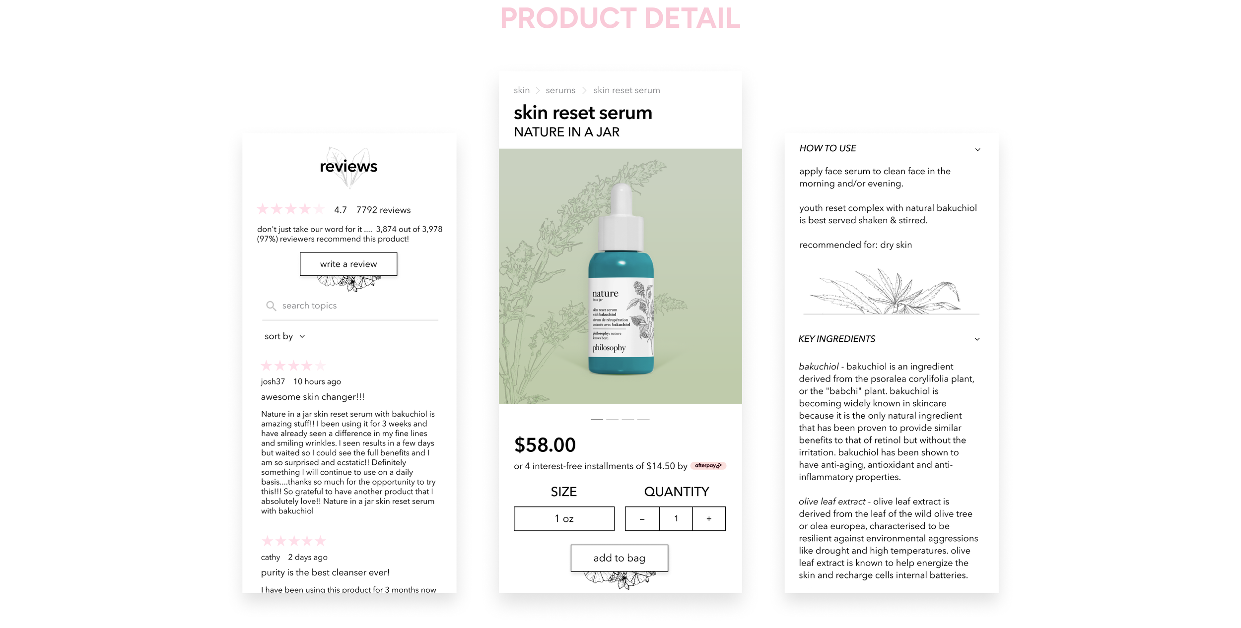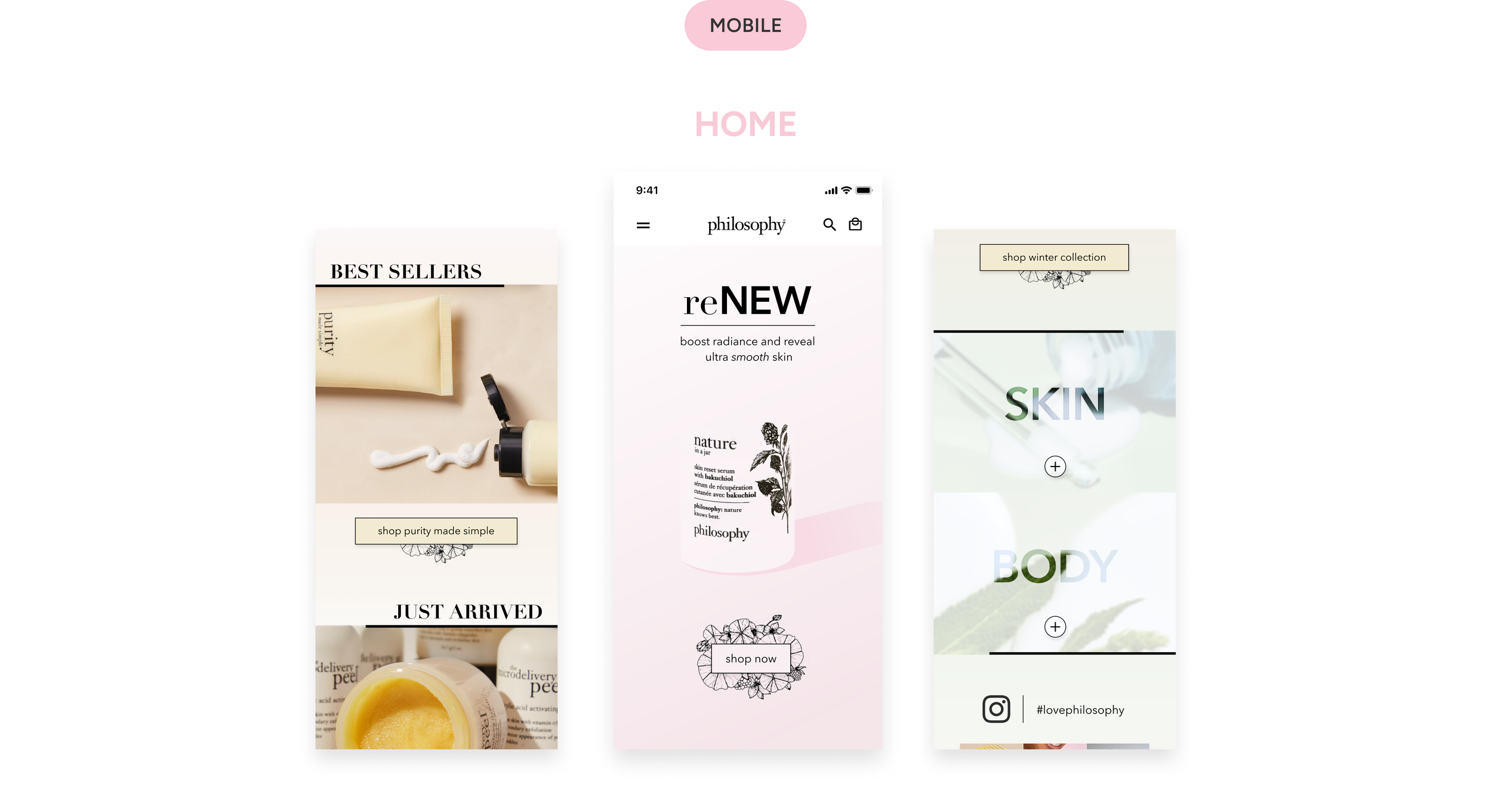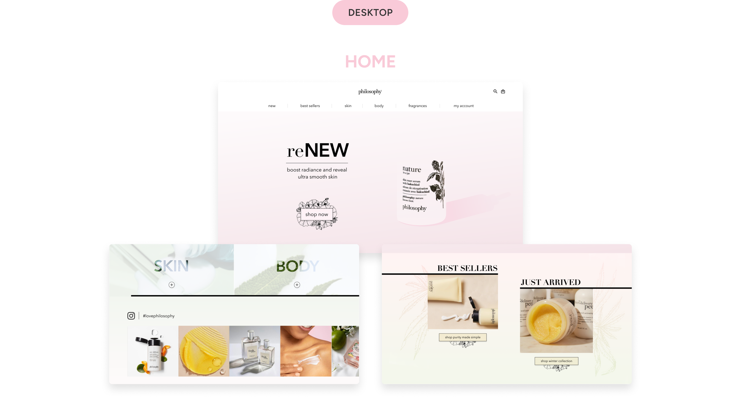 This website redesign highlights philosophy's mission to use the power of nature to inspire beautiful skin, through the use of soft colors